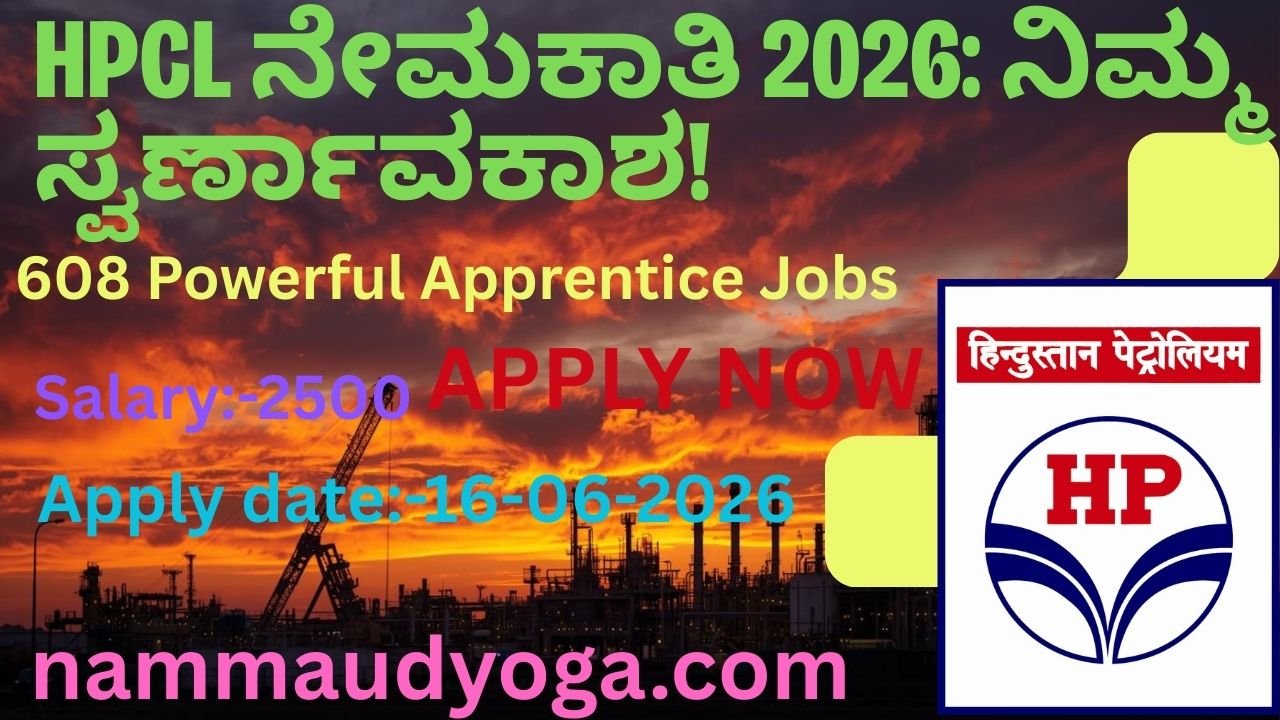 ಭಾರತ ಸರ್ಕಾರದ ಮಹಾರತ್ನ ಸಂಸ್ಥೆಯಾದ Hindustan Petroleum Corporation Limited (HPCL) 2026ನೇ ಸಾಲಿನ Graduate Apprentice ನೇಮಕಾತಿ ಅಧಿಸೂಚನೆಯನ್ನು ಪ್ರಕಟಿಸಿದೆ. HPCL Recruitment 2026 ಮೂಲಕ ಒಟ್ಟು 608 ಇಂಜಿನಿಯರಿಂಗ್ ಹುದ್ದೆಗಳು ಭರ್ತಿಯಾಗಲಿವೆ.ಇಂಜಿನಿಯರಿಂಗ್ ವಿದ್ಯಾರ್ಥಿಗಳು ನಮ್ಮ ವೆಬ್‌ಸೈಟ್‌ನ Latest Engineering Jobs 2026 ಪುಟವನ್ನು ಕೂಡ ಪರಿಶೀಲಿಸಬಹುದು, ಅಲ್ಲಿ ಇತ್ತೀಚಿನ ಎಲ್ಲಾ core branch ಅವಕಾಶಗಳನ್ನು ನಾವು update ಮಾಡುತ್ತೇವೆ.