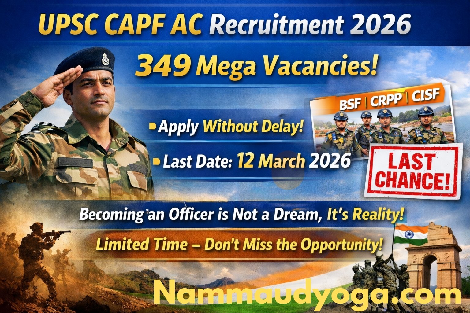 UPSC CAPF AC Recruitment 2026 ಅಧಿಕೃತ ಅಧಿಸೂಚನೆ ಪ್ರಕಟವಾಗಿದ್ದು, ಒಟ್ಟು 349 Assistant Commandant (Group A) ಹುದ್ದೆಗಳ ಭರ್ಜರಿ ನೇಮಕಾತಿ ಪ್ರಕ್ರಿಯೆ ಆರಂಭವಾಗಿದೆ. Union Public Service Commission (UPSC) ನಡೆಸುವ ಈ CAPF ಪರೀಕ್ಷೆ ದೇಶದ ಪ್ರಮುಖ ಕೇಂದ್ರ ಸಶಸ್ತ್ರ ಪೊಲೀಸ್ ಪಡೆಗಳಲ್ಲಿ ಅಧಿಕಾರಿಯಾಗುವ ಸುವರ್ಣಾವಕಾಶ ನೀಡುತ್ತದೆ.